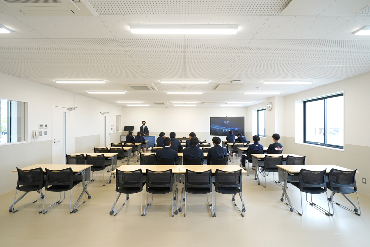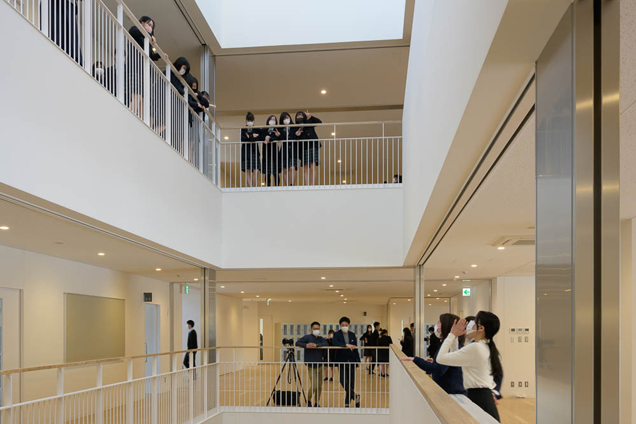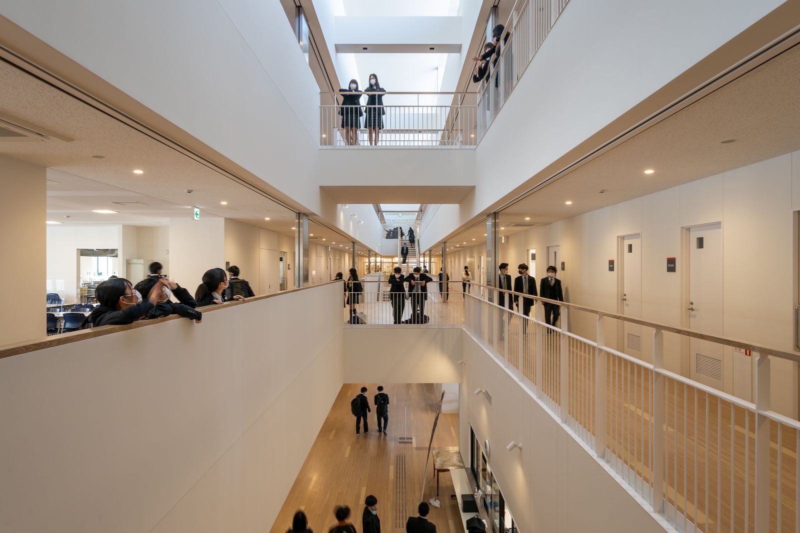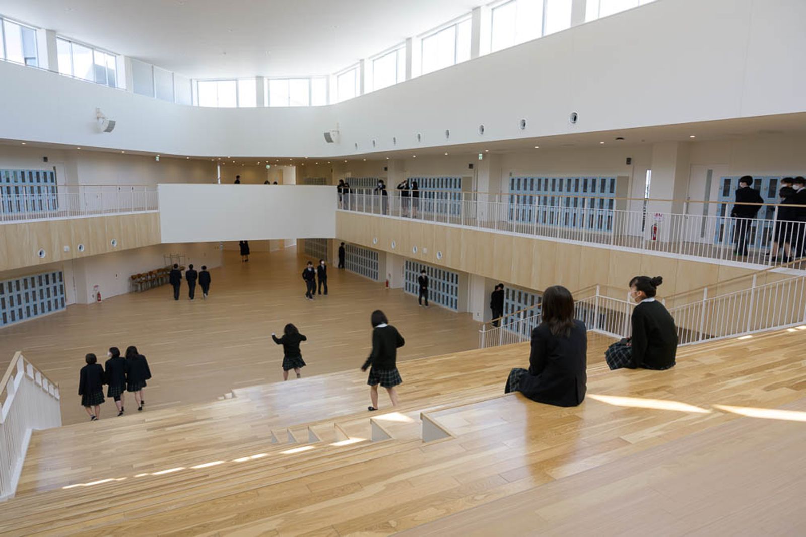 一般教室が取り囲む大空間で、生徒同士の語らい、思索、創造のPLAZAです。
