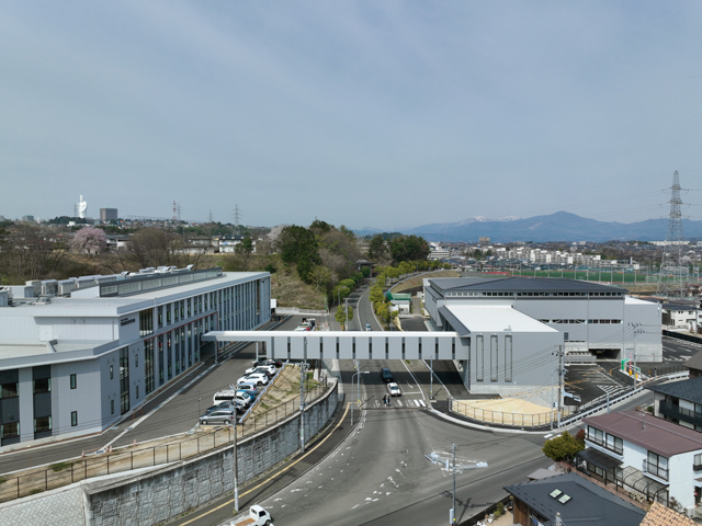 - 車道にて分断されているキャンパスを連絡橋で結び一体化の実現